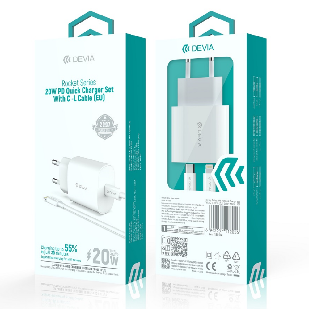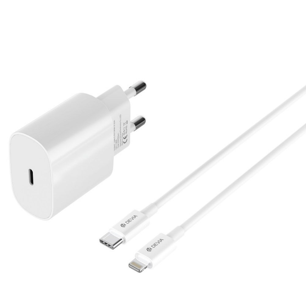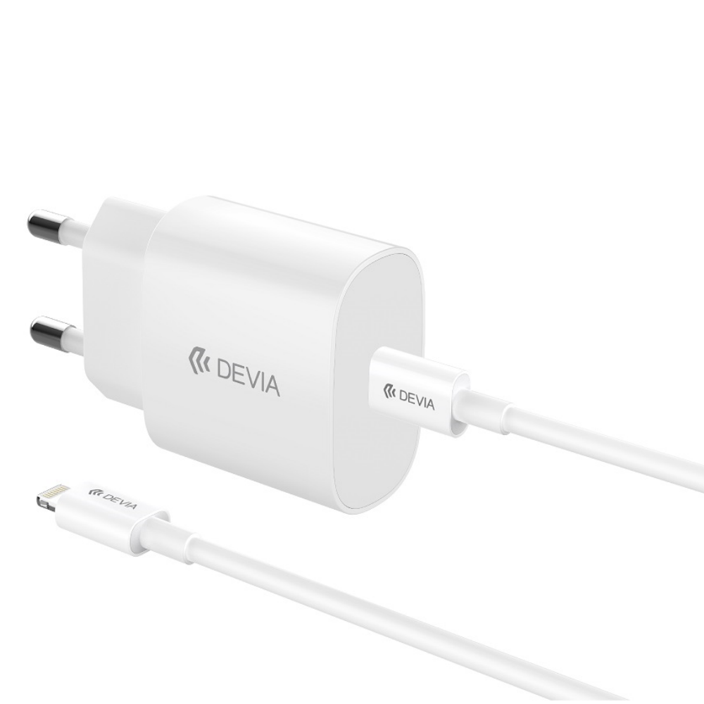 Încărcător rețea Devia Rocket RLC-380, USB-C, Power Delivery 20W, Alb, cu Cablu USB-C la Lightning inclus